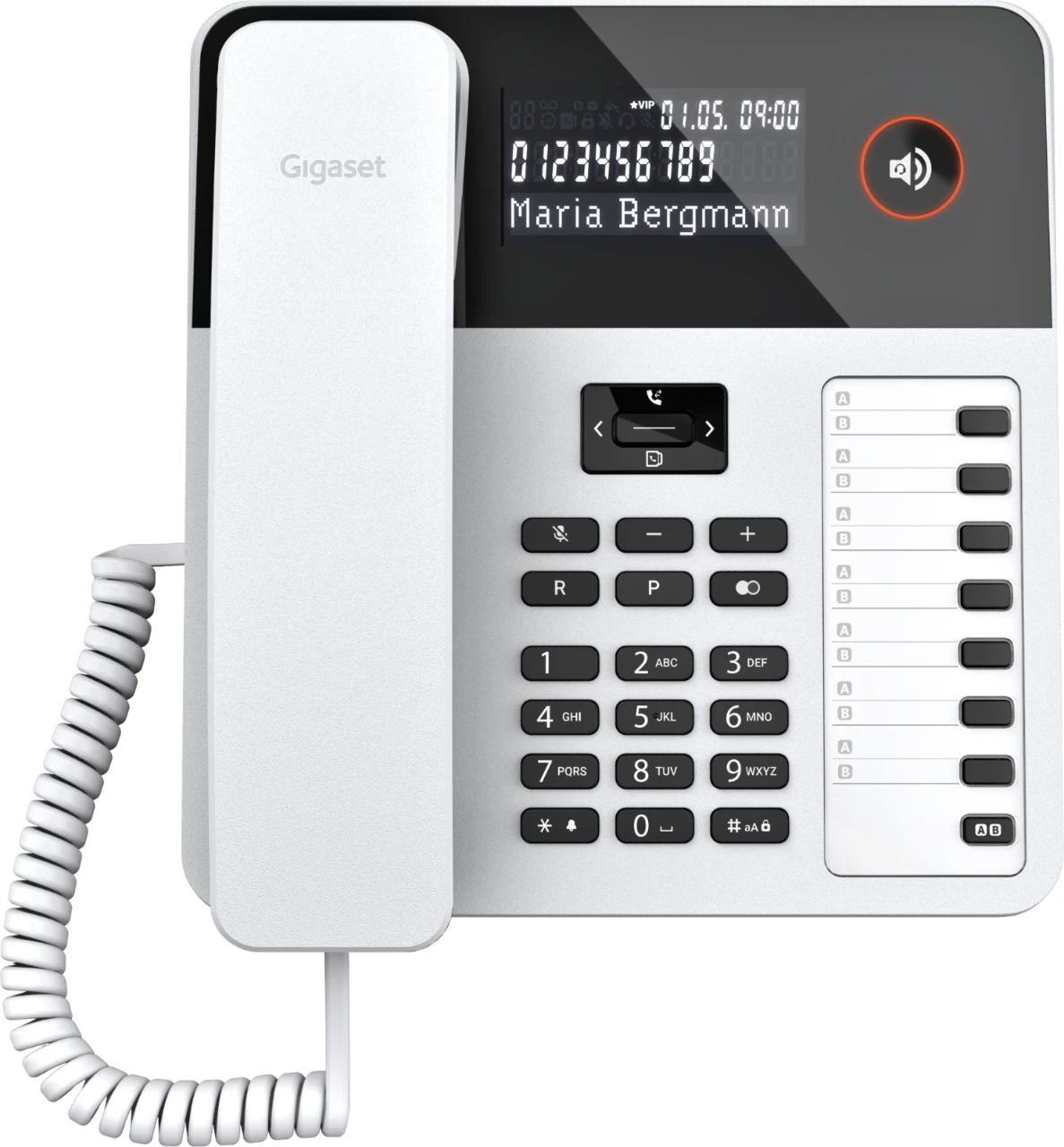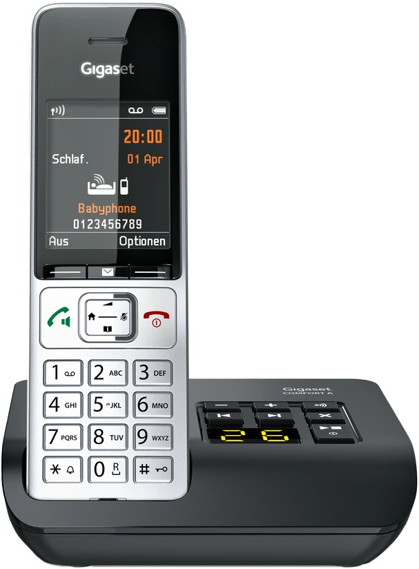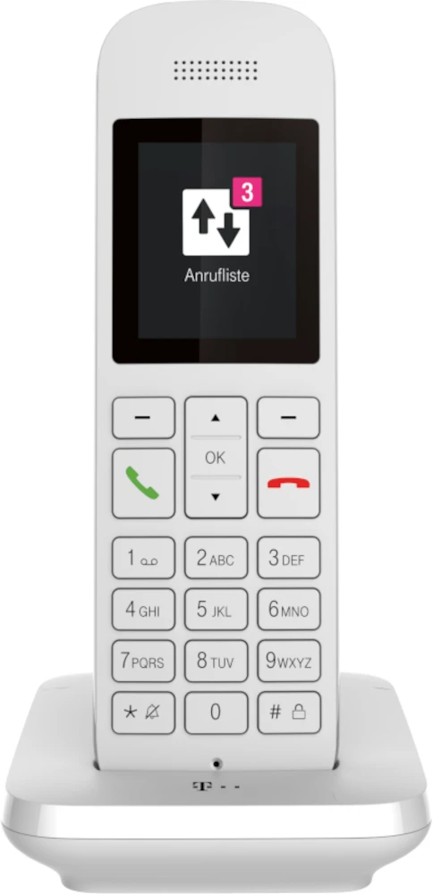 Schnurloses DECT-Telefon-Kombination mit integriertem Anrufbeantworter (20 Min. Aufzeichnung) im Einstiegsbereich, bestehend aus einer schnurgebundenen Basisstation und einem Mobilteil mit Ladeschale, geeignet für den Standardanschluss.