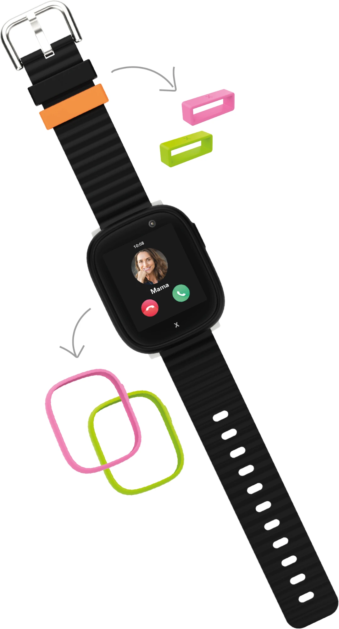 Zu jeder X6Play in Schwarz erhältst du zusätzlich zwei Frames für die Uhr und zwei Loops für das Armband in Pink und Grün. So könnt ihr ganz einfach die Farbe der Smartwatch wechseln — ganz nach Lust und Laune deines Kindes. Auch das Ziffernblatt lässt sich ganz nach den Wünschen deines Kindes anpassen: Heute bunt, morgen schlicht. Analog oder digital.